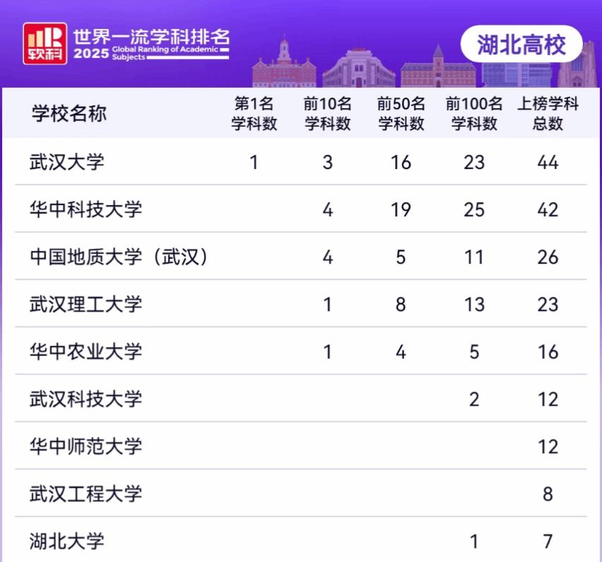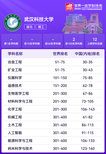 武科大网讯 11月18日,高等教育评价专业机构软科发布2025“世界一流学科排名”。我校12个学科上榜,位居湖北省属高校第1、全省高校第6位。