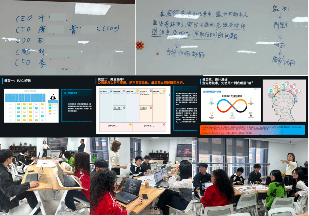 本次工作坊特邀剑桥大学教育学博士唐文娜全程指导,采用PBL项目式学习模式,聚焦前沿社会议题,开展沉浸式实战研讨。来自不同专业的学生自主组建团队,围绕“AI+智慧养老”主题,参照现代企业组织架构进行协同分工与高效协作。活动中,学生灵活运用AI技术、商业画布、设计思维等工具,经历了问题研判、创意共创、方案研发与成果路演全流程,最终形成多项具有创新性的智慧养老解决方案。