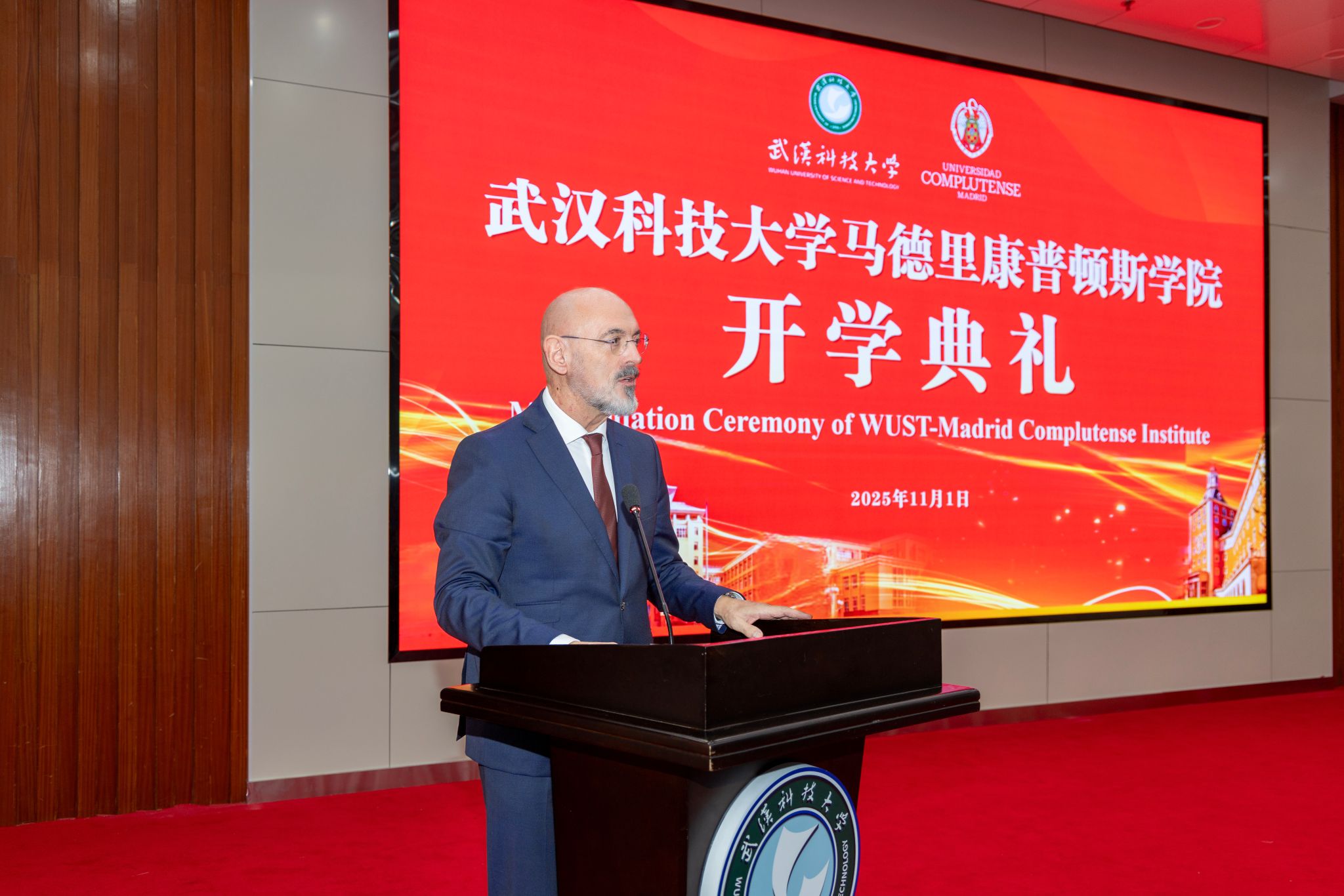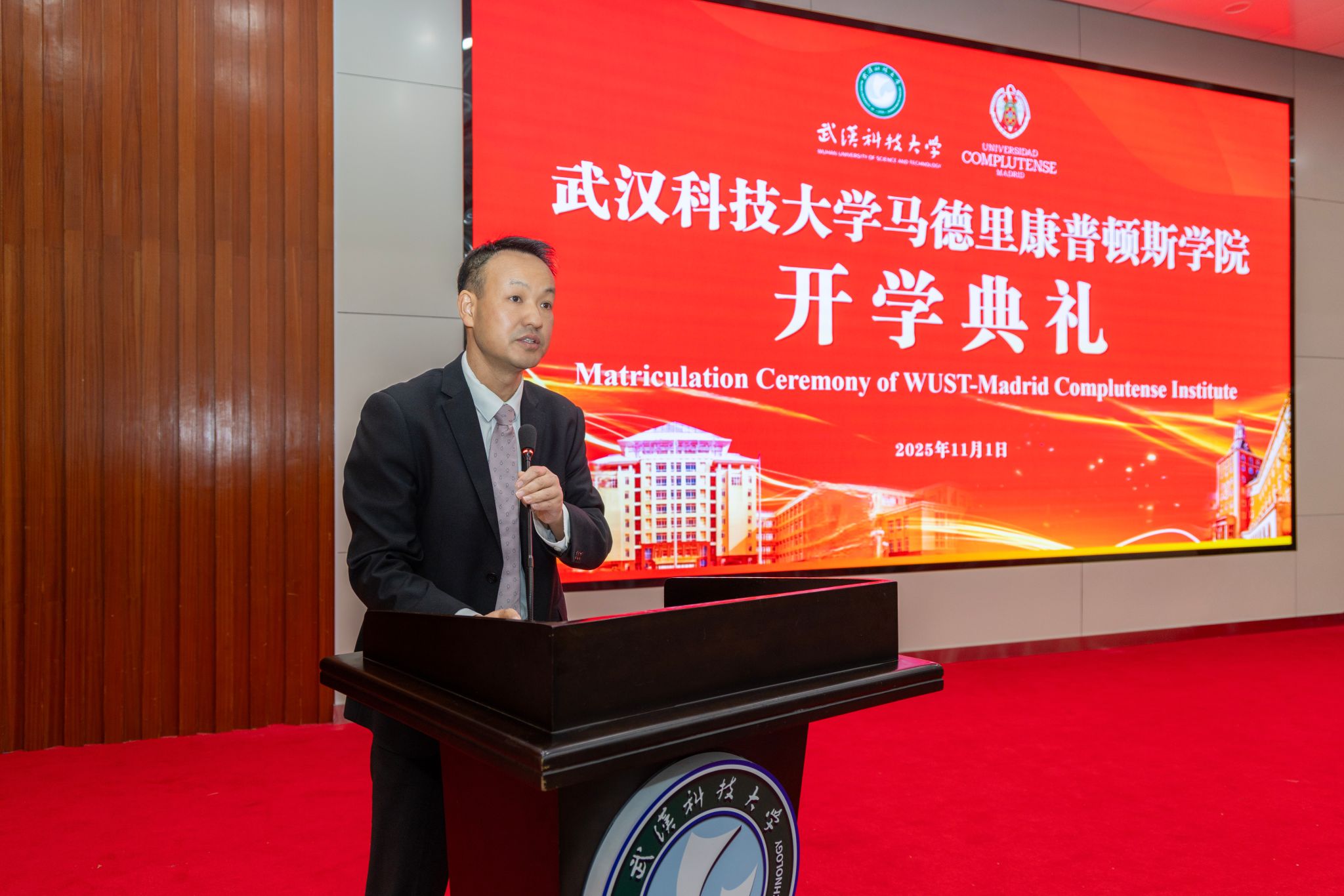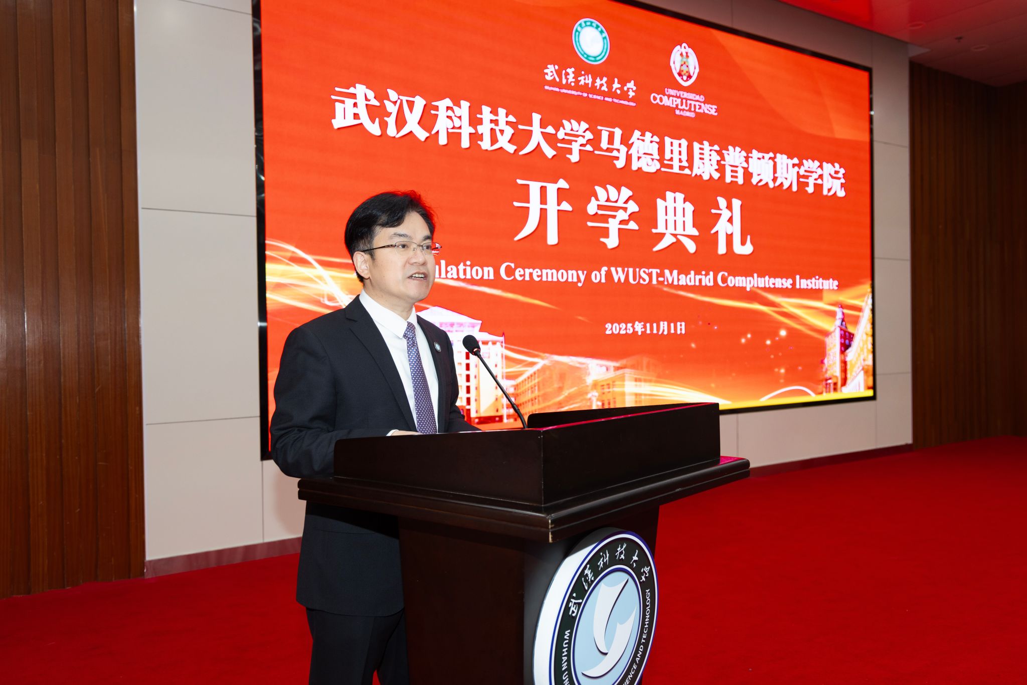 武科大网讯(记者肖宇瑄 见习记者胡泰山)11月1日上午,武汉科技大学马德里康普顿斯学院2025级新生开学典礼在黄家湖校区崇实会堂隆重举行。湖北省教育厅副厅长戴伟,西班牙马德里康普顿斯大学校长华金·戈亚契·戈尼,我校党委书记倪红卫,党委副书记、校长吕勇等中西嘉宾与274名马德里康普顿斯学院首届新生齐聚一堂,共同见证这一历史性时刻。开学典礼由我校副校长董丽杰主持。