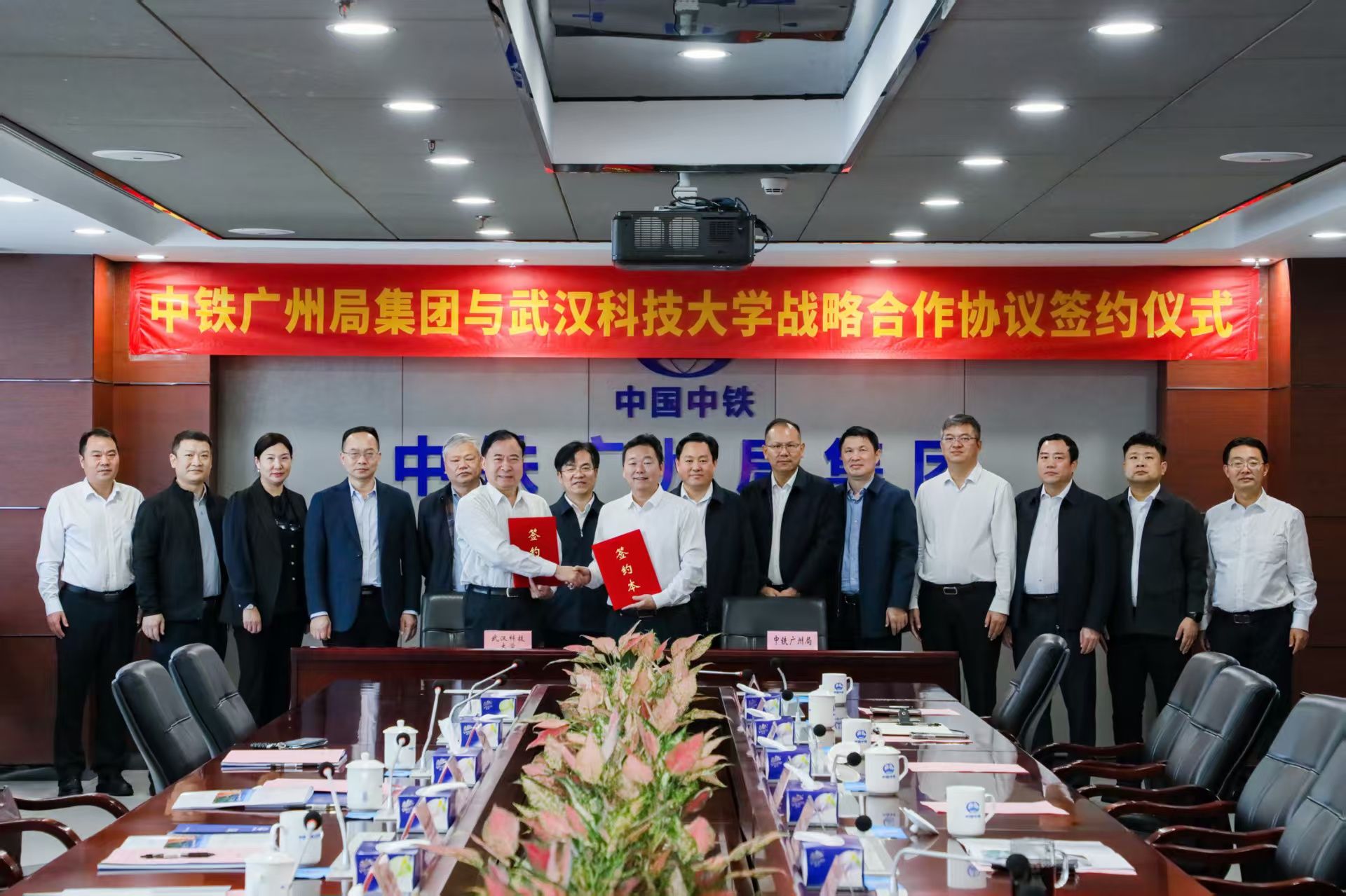 武科大网讯 11月 13日,我校与中铁广州工程局集团有限公司(以下简称 “中铁广州局”)战略合作暨共建爆破技术研究中心续约签约仪式在广州南沙中铁广州局举行。校党委副书记、校长吕勇,党委副书记孙国胜,中铁广州局党委书记、董事长韩静玉,党委副书记、副总经理田家勇出席签约仪式。