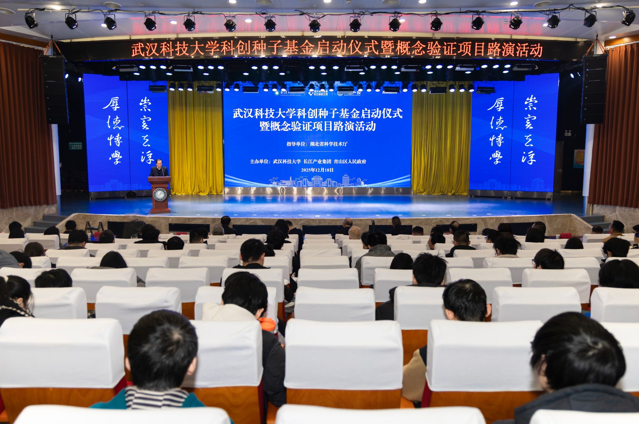 武科大网讯(记者余蔓菲 王钰然) 12月18日,我校2025年科创种子基金启动仪式暨概念验证项目路演评审会(重点突破项目专场)在青山校区碧园会堂举行。在省财政厅指导和支持下,学校联合长江产业投资集团、武汉市青山区人民政府共同发起设立总规模2亿元的科创种子基金,创下我省省属高校之最。该基金旨在破解科技成果转化“最初一公里”资金瓶颈,贯通科技创新全链条,培育发展新质生产力。