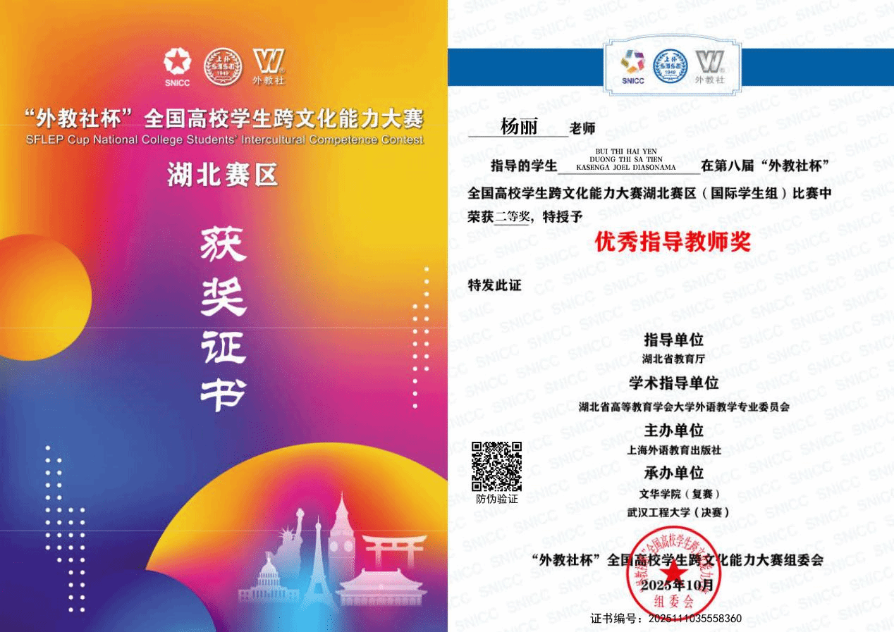 武科大网讯 近日,第八届“外教社杯”全国高校学生跨文化能力大赛湖北赛区复赛在文华学院和中国地质大学(武汉)圆满落幕。我校越南留学生裴海燕(BUI THI HAI YEN)、杨氏沙进(DUONG THI SA TIEN)及刚果(金)留学生李乐(KASENGA JOEL DIASONAMA)组成的团队表现突出,荣获湖北赛区二等奖,国际教育学院老师杨丽获“优秀指导教师奖”。