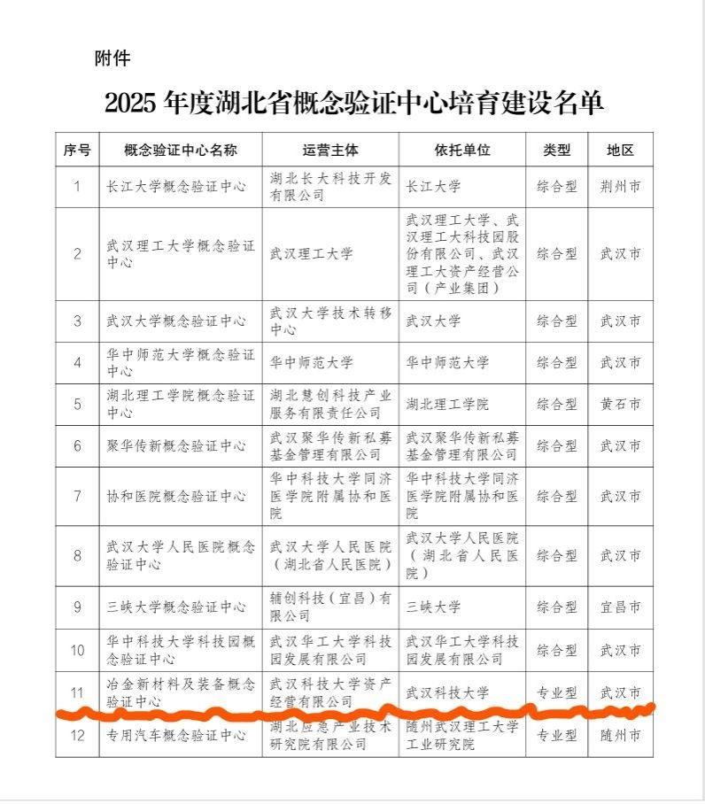 武科大网讯 近日,从湖北省科技厅传来喜讯,我校牵头申报的“冶金新材料及装备概念验证中心”项目正式获批,入选2025年度湖北省概念验证中心培育建设名单,位居“专业型”概念验证中心首位。该中心的成立标志着湖北省在打通冶金领域科技成果转化“最初一公里”、推动创新链与产业链深度融合方面迈出了关键一步。