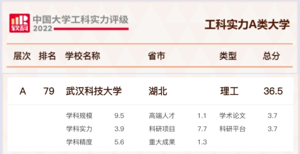 武科大网讯(记者陈孖川)11月7日,高等教育评价专业机构软科正式发布2022中国工科实力百强大学名单。我校位列第79名,居湖北高校第五,是湖北省属高校中唯一上榜高校。