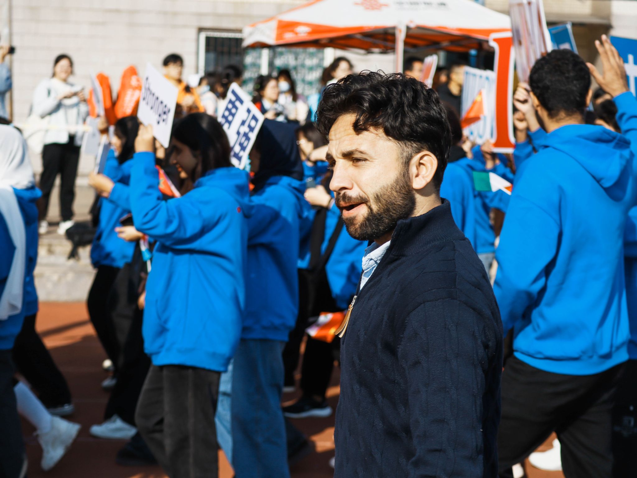 党委研究生工作部副部长毛宝盛给学生带奖牌 卓凌晞摄