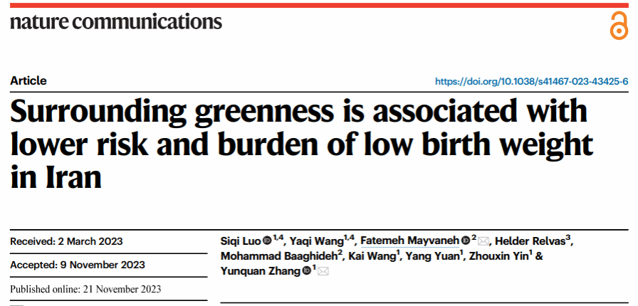 武科大网讯 近日,医学部公共卫生学院张云权老师团队在综合性期刊Nature Communications(IF2022=16.6)上发表原创研究论文Surrounding greenness is associated with lower risk and burden of low birth weight in Iran(https://www.nature.com/articles/s41467-023-43425-6)。论文(共同)第一作者为武汉科技大学公共卫生学院硕士研究生罗思琦(2020级)、王亚奇(2022级),共同通讯作者为Fatemeh Mayvaneh博士和张云权老师,武汉科技大学为第一作者单位。